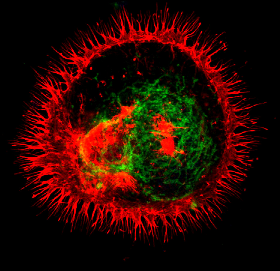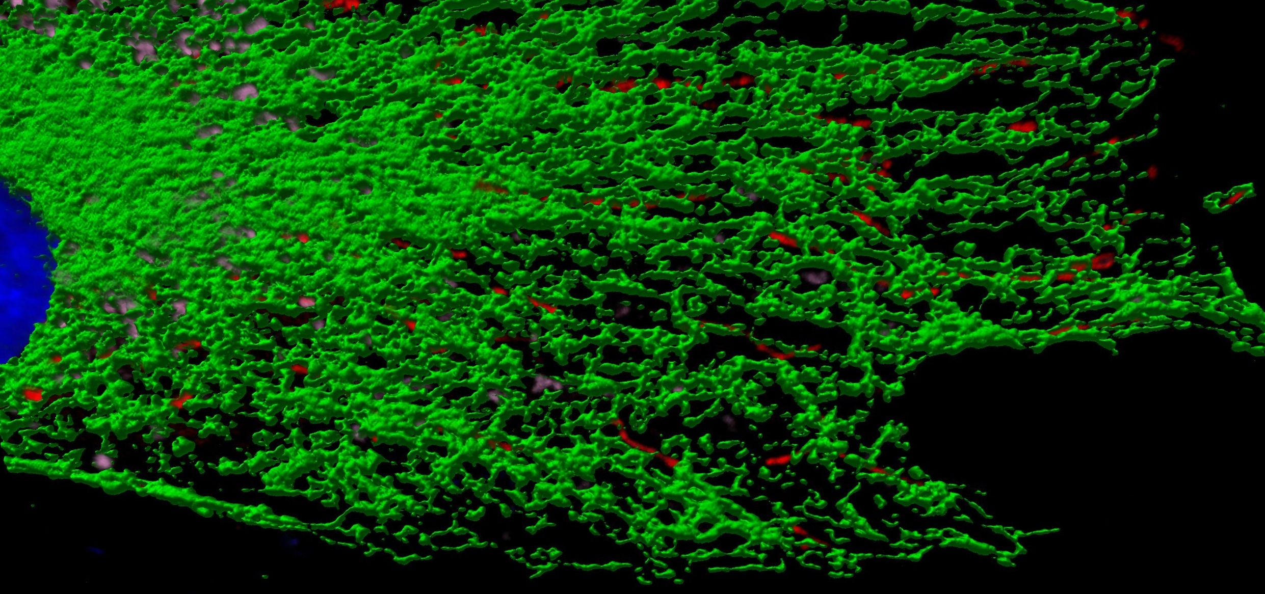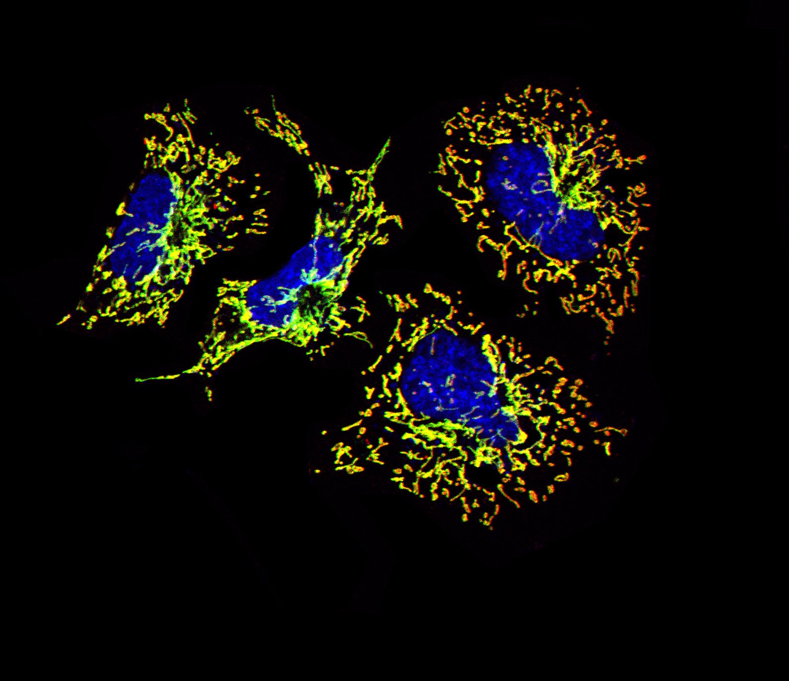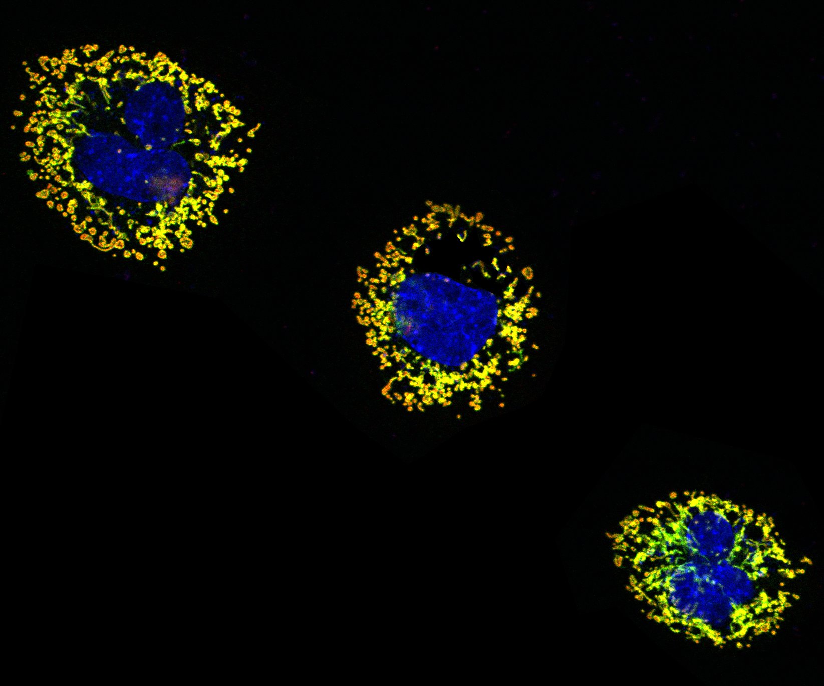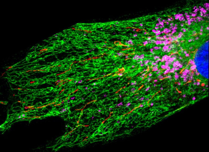 The image shows neuroblastoma cells neuro-2a (N2a), two fluorescent antibodies were used to mark the outer membranes (TOM20) in green…