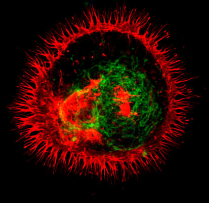 Cancer metastasis represents an advanced stage of malignancy, leading to cancer-related deaths. Metastasis is a multistep process that includes migration and invasion of cancer cells in a new region. The images here represent a migrated breast cancer cell ready to proliferate under an invitro condition. Cell migration is an integrated process including development of cellular protrusions, attachment, and then causing secondary changes. We have observed protruding actin cytoskeleton (red) while attaching to an extracellular matrix. This resulted in rapid changes in mitochondrial dynamics (green) during attachment (fusion) and at cell division (fission). Since mitochondria has diverse role in cellular functioning, we believe this might help us to understand the role of mitochondria in this world of cancer metastasis.