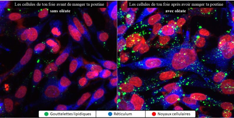 Confocal microscopy of human hepatic carcinoma (HepG2) cells with (right photo) or without (left photo) incubation with oleate for 24 hours. The cells were then marked with fluorescent molecules to reveal in green the lipid droplets (lipid reserves of the cells), in blue the endoplasmic reticulum (communication network inside the cells) and in red the cell nuclei. containing DNA. Oleate, the main lipid in dietary fat, has been observed to cause the formation of many of the lipid droplets. The elements necessary for this formation seem to pass through the reticulum. The analysis of the mechanisms involved in the formation of these lipid droplets will allow us to better understand the impacts of Western-style diets on the health of our liver.