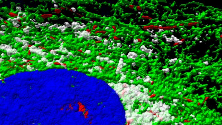 Communication is an essential connecting tool among living organisms. However, it is not only limited to the level of the organism but to coordinate cell function, cell organelles are always in bond with each other. Mitochondria are one of the essential organelles that coordinate the metabolic process in the cell. Mitochondria can control the function of other organelles by modulating their interaction with them. This interaction is affected by various diseases, especially mitochondrial diseases. Our laboratory is interested in disentangling the potential interaction of mitochondria (red) with endoplasmic reticulum (green) and lysosomes (white / magenta) using a powerful microscopic imaging technique as shown in the image (Human fibroblasts, core – blue).