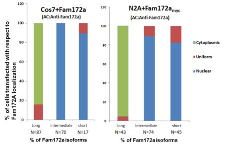 Percentage of transfected Co7 and N2A cells relative to the subcellular localization of the different isoforms of Fam172a