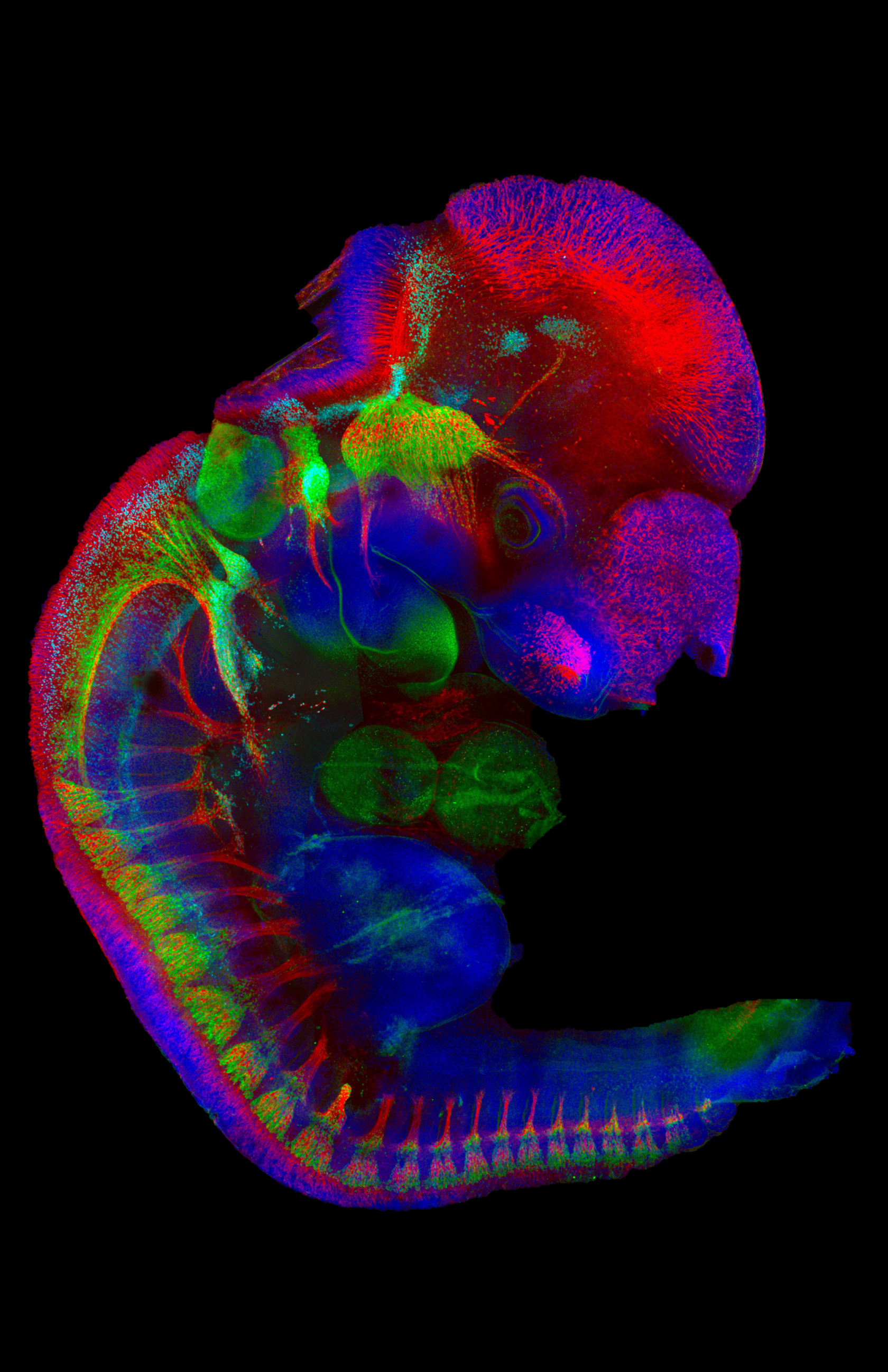 Voici un embryon de souris au 10ème jour embryonnaire (mi-gestation). Les cellules de la crête neurale (en vert) sont à…