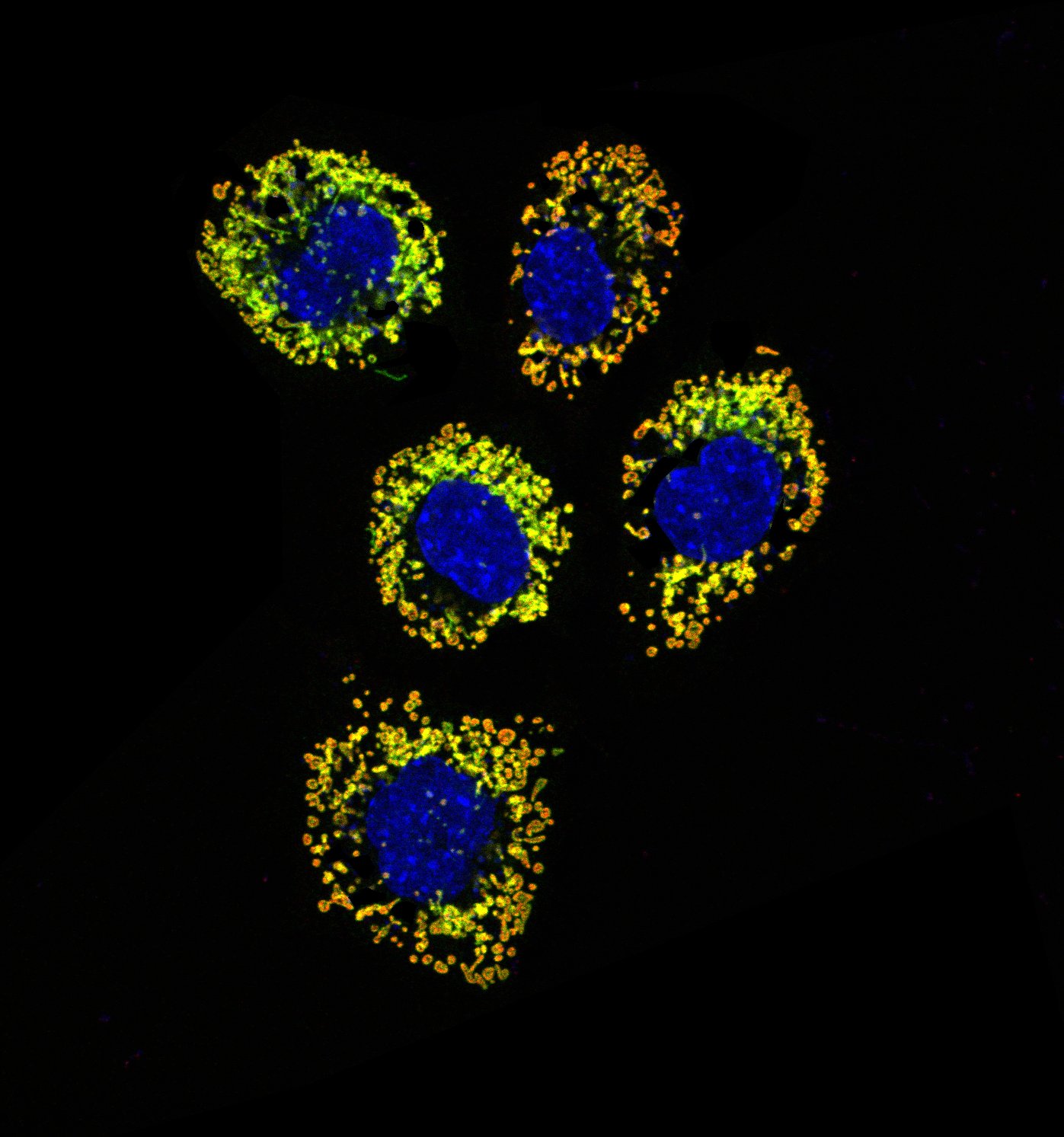 L’image montre des cellules de neuroblastomes neuro-2a (N2a), deux anticorps fluorescents ont été utilisé pour marquer les membranes externes (TOM20)…