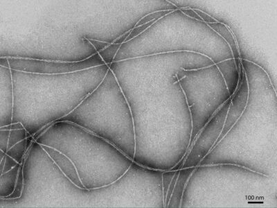 Image par microscopie électronique à transmission de fibres amyloïde de l’islet amyloid polypeptide, l’échelle est de 100 nm.