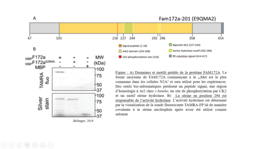 Le laboratoire Pilon a récemment mis en évidence le gène FAM172A comme étant un nouveau gène candidat pour ce syndrome. Des études préliminaires ont révélé que la protéine FAM172A régule certains évènements clés d’épissage alternatif co-transcriptionnel. Cette régulation se fait via une interaction avec la fraction nucléaire d’Argonaute 2 (AGO2), de même qu’avec la chromatine et l’ARN. Ces résultats nous permettent d’émettre l’hypothèse qu’une dérégulation de l’épissage alternatif et une perturbation du paysage transcriptionnelle spécifique aux cellules de la crête neurale, correspond au mécanisme pathologique commun pouvant causer le syndrome CHARGE. D’autres analyses bioinformatiques prédisent de nombreux domaines fonctionnels à la protéine FAM172A, tel qu’un motif sérine hydrolase, et une séquence consensus de phosphorylation par la Caséine Kinase 2 (CK2). Ces deux motifs seront étudiés en détails dans le cadre de mon projet pour mieux comprendre le rôle et la régulation de FAM172A. Ces réponses nous permettront également de mieux cerner le mécanisme d’action pathologique responsable du syndrome CHARGE.
